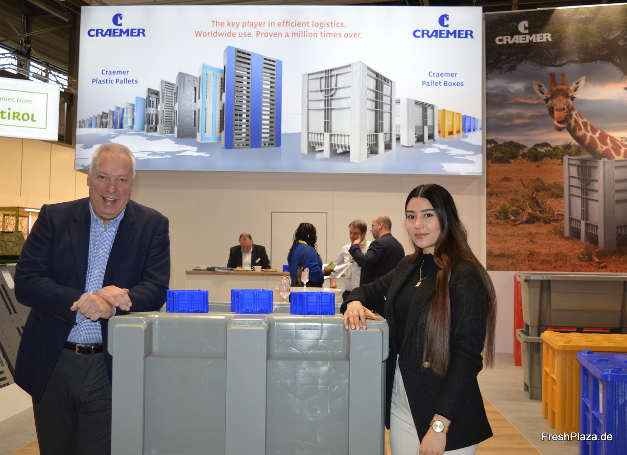Die Runden-Gruppe war mit mehreren Tochterunternehmen auf der Fruit Logistica vertreten. Zur Unternehmensgruppe gehört auch die Ecobyte GmbH, die sich der Digitalisierung von Mehrwegkreisläufen widmet. Im Bild: Klaus Endebrock und Justin Geller.