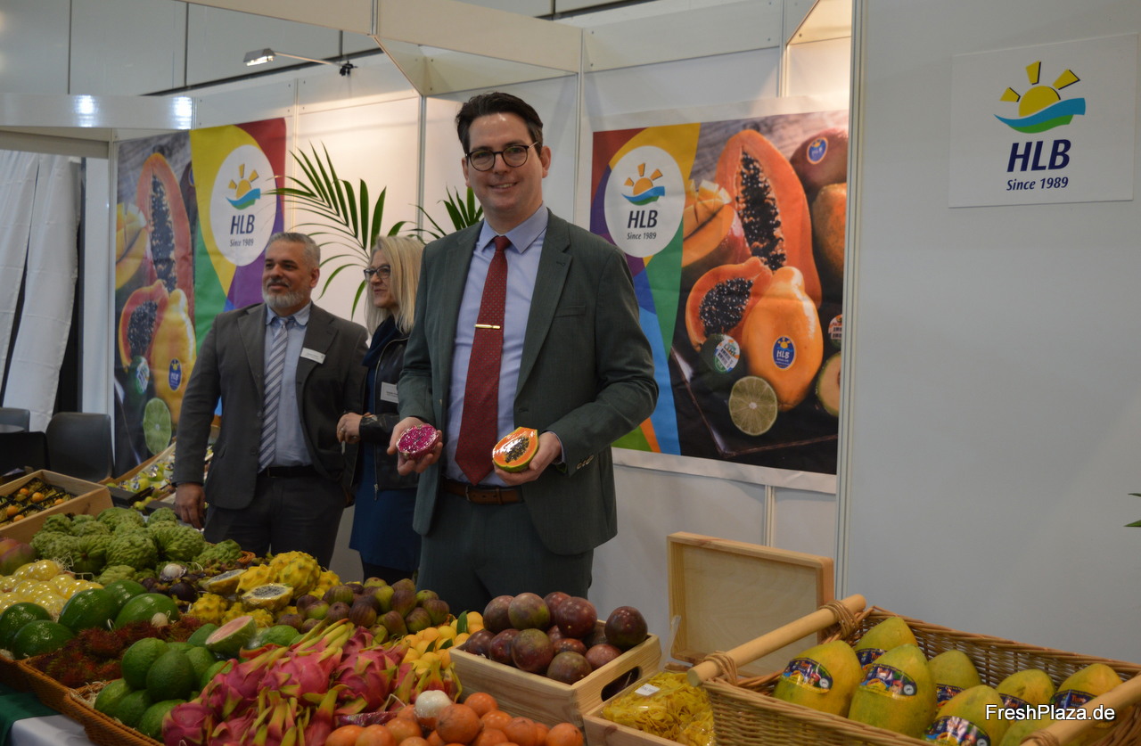 Lorenz Hartmann de Barros am Stand der Firma HLB. Das international verzweigte Unternehmen feiert in diesem Jahr dessen 35-jährige Jubiläum und hat sich auf den internationalen Vertrieb von Fruchtexoten spezialisiert. Unter Federführung von Lorenz Hartmann de Barros ist die deutsche Firma mit Sitz in Kelsterbach in den vergangenen Jahren stetig gewachsen.