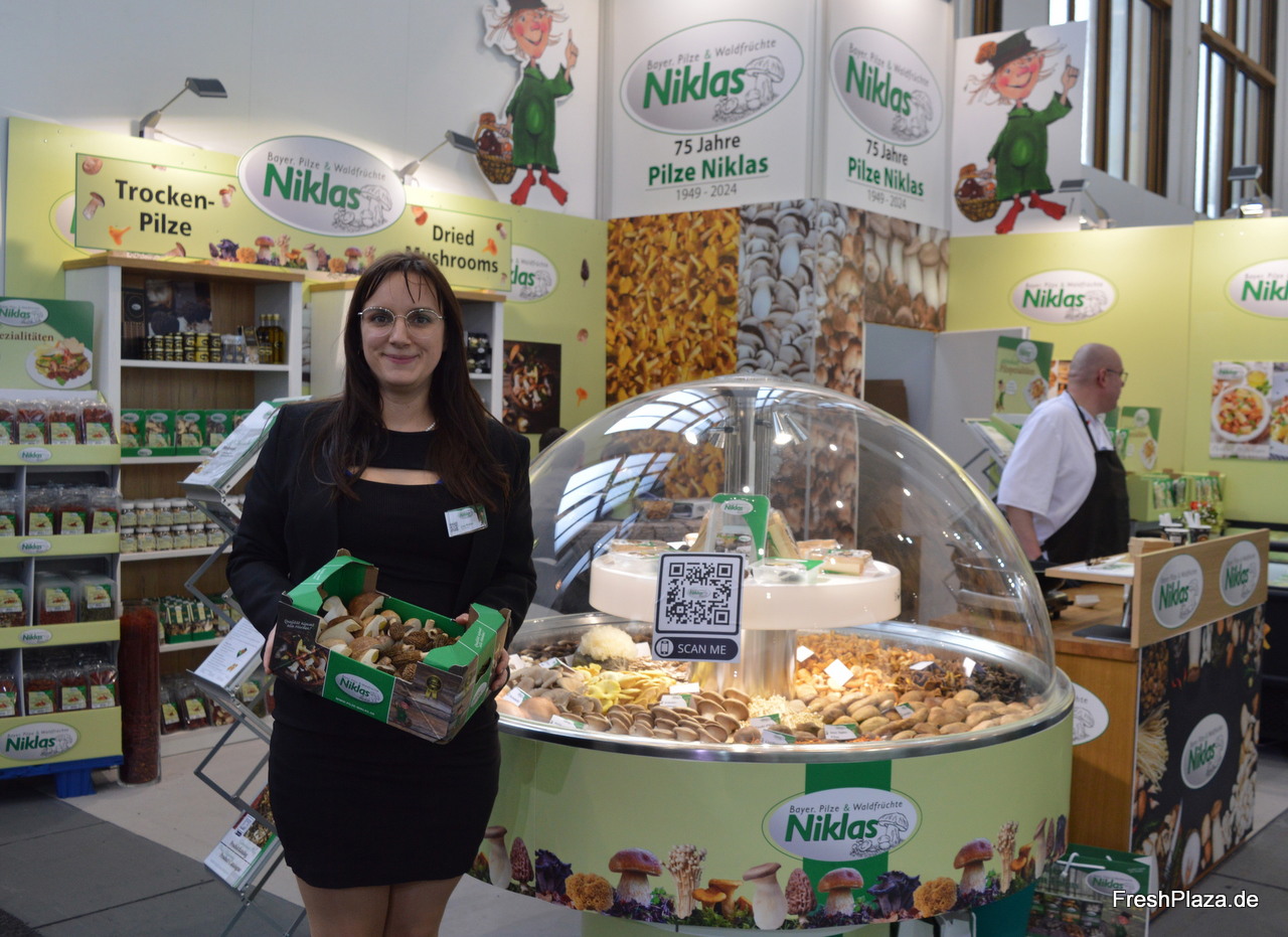 Lisa Niklas vom gleichnamigen, bayerischen Familienunternehmen präsentierte einen breiten Auszug an frischen, getrockneten und tiefgekühlten Pilzprodukten. Im Bild zeigt Frau Niklas eine Mischung aus chinesischen Morcheln und südafrikanischen Steinpilzen.