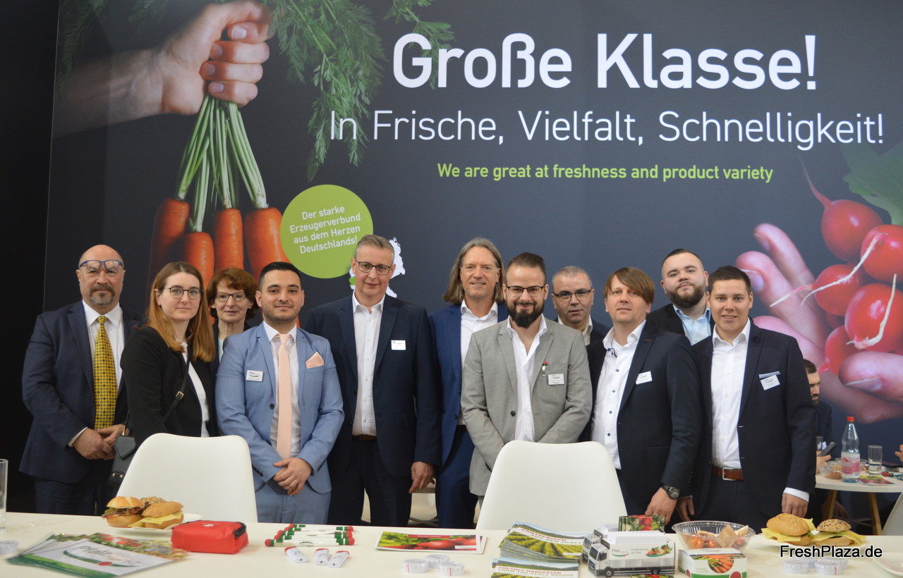 Die Belegschaft der Widmann GmbH am Gemüsering-Stand. Das Unternehmen zählt zu den führenden Heidelbeerlieferanten Deutschlands und verfügt über Produktionsstandorte in mehreren Ländern. Links im Bild: Firmenchef Hans Widmann.