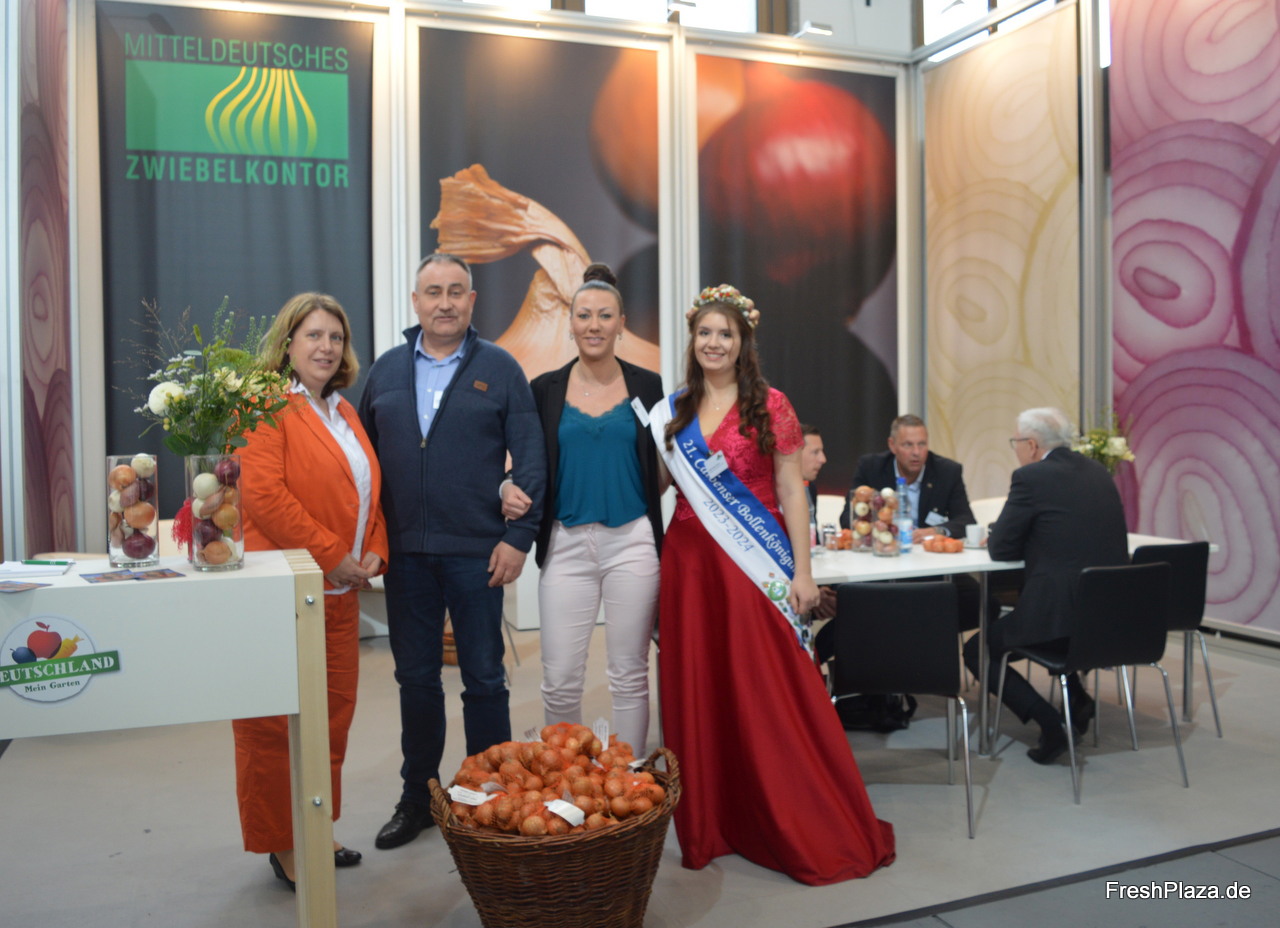 Auch das Mitteldeutsche Zwiebelkontor war mit einem eigenen Stand vertreten. Im Bild: Geschäftsführerin Christine Schneider (l) mit zwei Kollegen sowie der Calbenser Bollenkönigin.