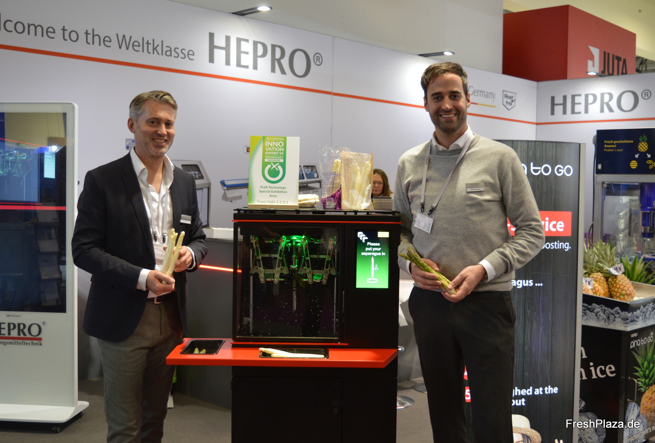Christoph Wolter und Philipp Haupt präsentierten die SB-Spargelschälmaschine „spargel to go". Das Verfahren wurde für den erstmaligen Technology Innovation Award FLIA 2024 nominiert.