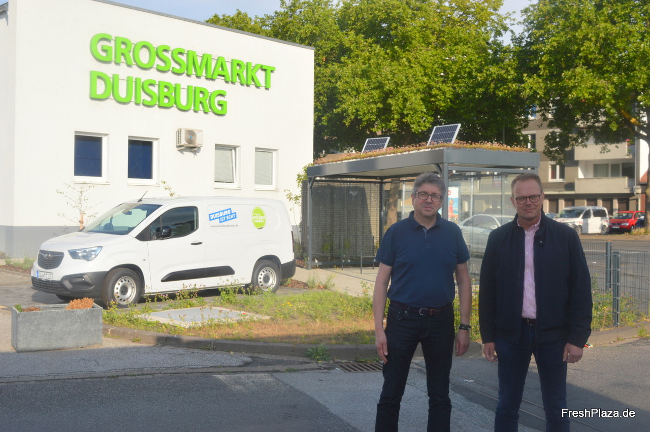 Udo Jesel und Alexander Klomparend von der Duisburg Kontor GmbH am Haupteingang des Großmarktes. Der Servicedienstleister betreut aktuell 26 Wochenmarktstandorte mit wöchentlich 49 Veranstaltungen.