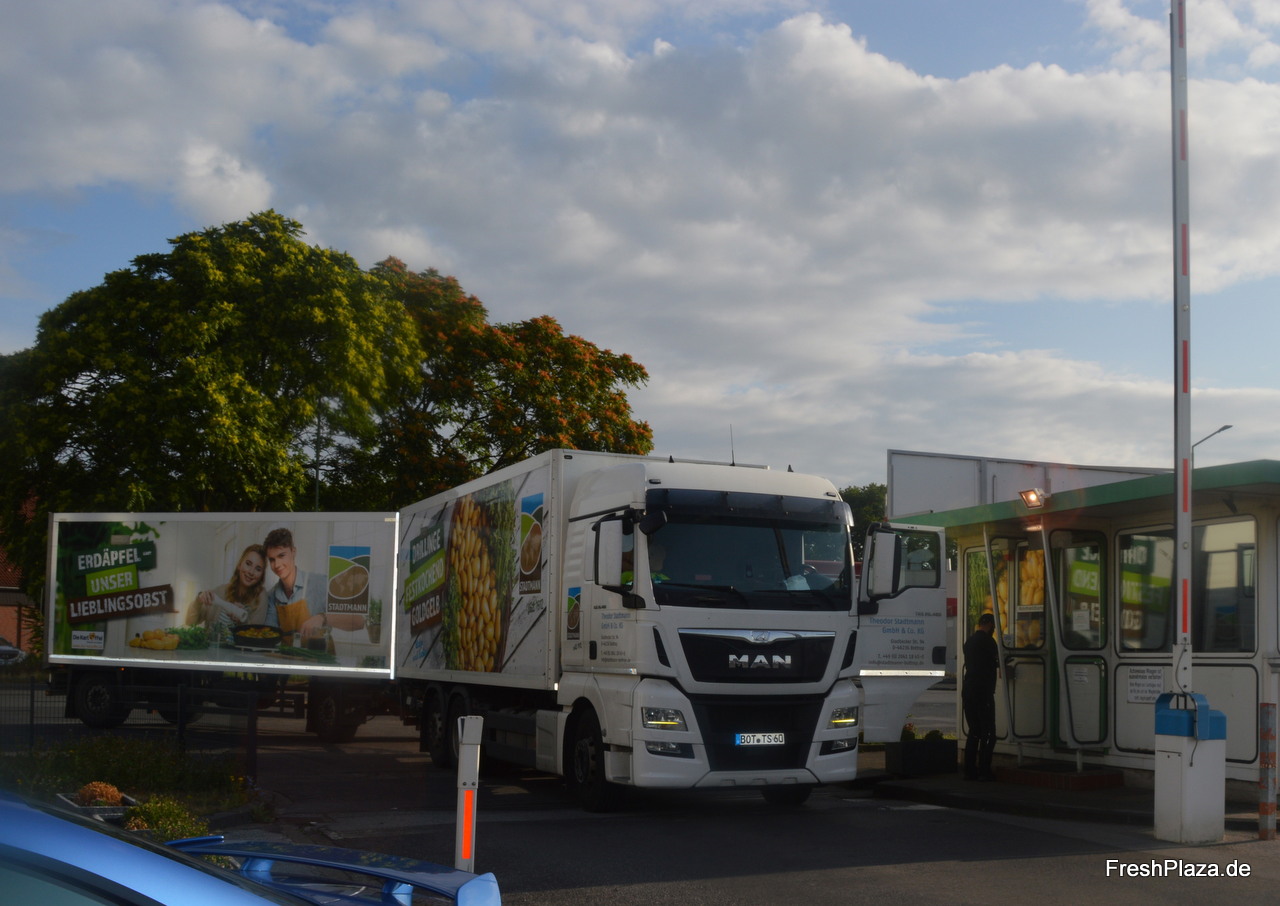 Ein LKW des Kartoffelgroßhandels Theodor Stadtmann aus Bottrop am Haupteingang zum Großmarkt.