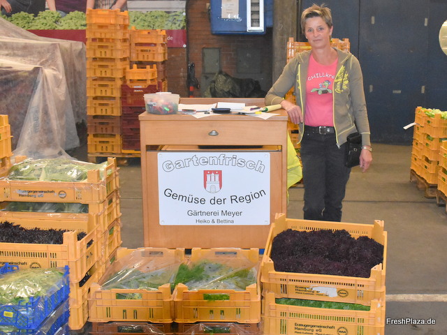 Frau Bettina Meyer der gleichnamigen Gärtnerei bewirtschaftet eine Anbaufläche von 6000m2 mit zwei Hektar Freilandgemüse. Der Gemüsebaubetrieb liefert u.a. Kerbel, Basilikum, Tomaten und bunte Salate aus eigenem Anbau und ist Mitglied der Hamburger Erzeugergemeinschaft.