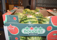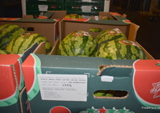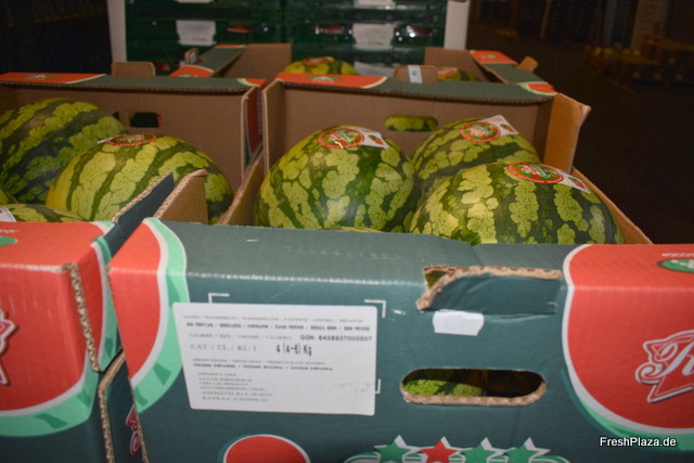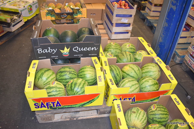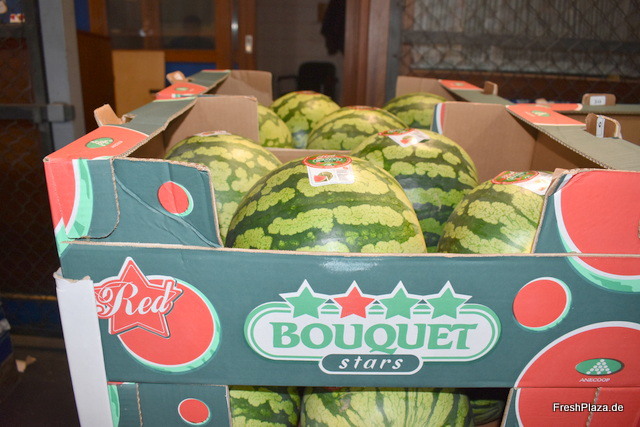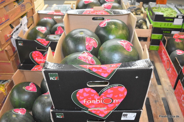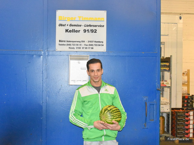 Ahmet Mercan auf dem Stand der Meypa GmbH: Auch hier sind Wassermelonen aktuell der Renner. Das Unternehmen bezieht ihre Ware u.a. aus dem Nahen Osten (Iran) und Marokko. Ab der ersten Juniwoche werden auch die erste italienischen Melonen erwartet, etwas früher als im Vorjahr.