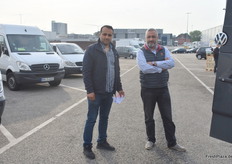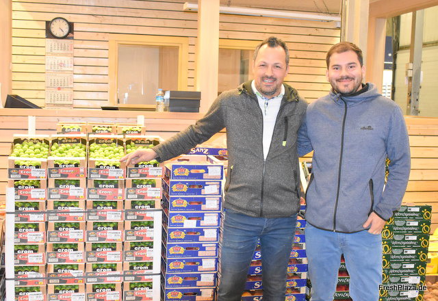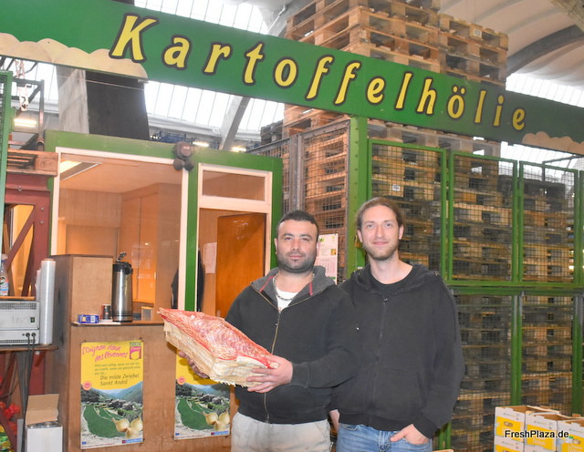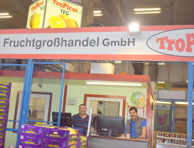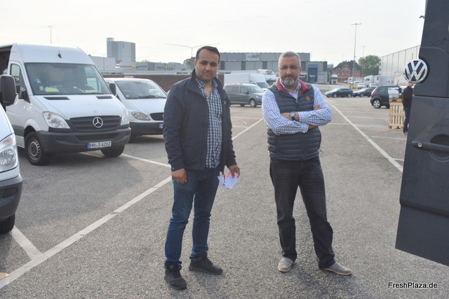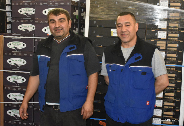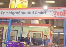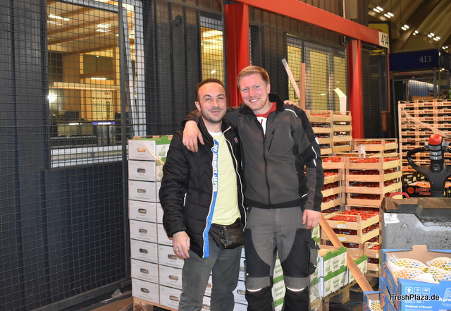 Ugur Özkök (links) - Standleiter der Helmut Ehmann GmbH und ein Mitarbeiter. Nach der Übernahme am Anfang des Jahres hat die neue Geschäftsführung das Sortiment rigorös geändert. Die bunte Paletten mit Exoten und tropischem Obst werden zur Zeit flott vermarktet und infolgedessen ist der Umsatz exponentiell angestiegen.