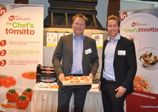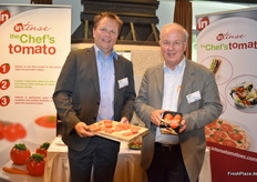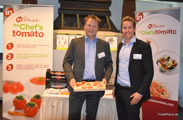 Hans Driessen und Stef Baetings zeigen ihre Intense- Tomaten. Die einzigartige Tomatenzüchtung ist besonders gut geeignet für Convenience-Zwecke da sie sich sehr gut schneiden lässt.