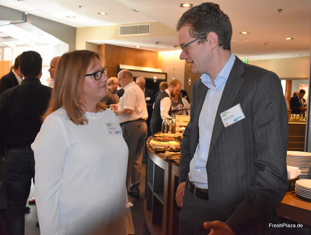 Michael Ternes der Edeka Handelsgesellschaft im Gespräch mit den französischen Kollegen der Firma Florette (Schnittsalate uvm) Valerie Henras (links) und Rachel Billard.