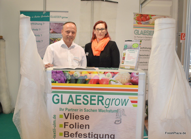 Michael Hinschelmann und Jessica Bailer der Firma Glaeser Grow. Das Unternehmen liefert Folientunnel für den geschutzten Anbau u.a. von Erdbeeren. Das neueste Spitzenprodukt im Katalaog sind die Greentex-Wollrasen die seit ca. einem Jahr erhältlich sind.