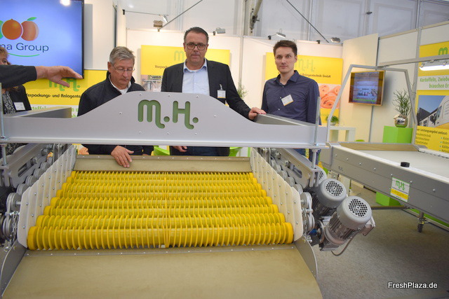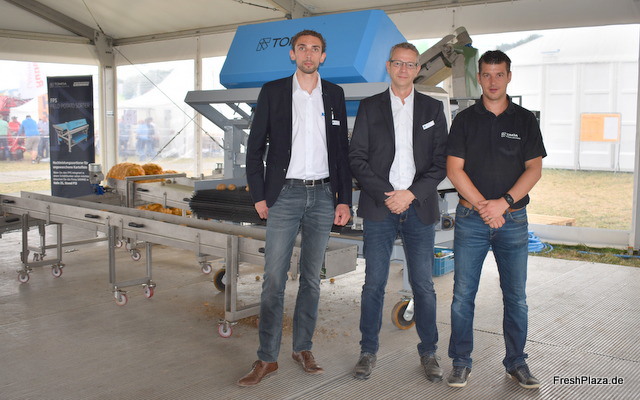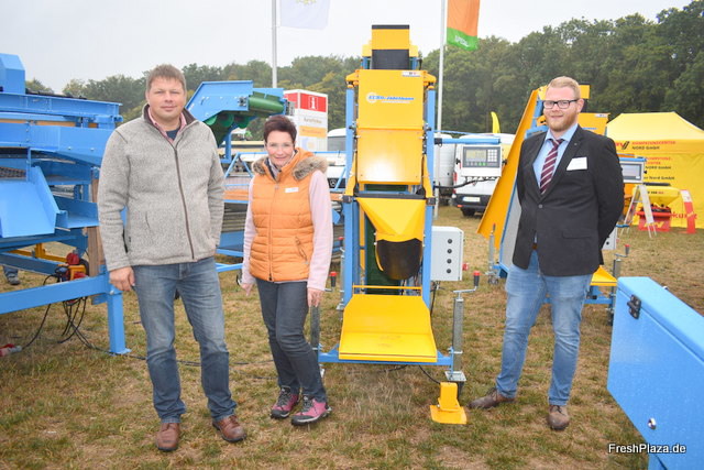 Michael Gertig, Geschäftsführer Michael Hornschemeyer und Christian Kluck zeigen den höchst modernen Enterder für Kartoffel. Auch der Verlesertisch mit verstellbarer Drehgeschwindigkeit ist eine bahnbrechende Lösung aus dem Produktsortiment.