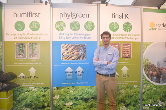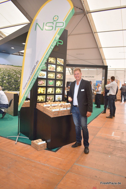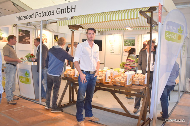 Arne Rehnert - Berater der Interseed Potatos GmbH auf dem Messestand. Das Züchtungsunternehmen hat eine Vielzahl interessanter Sorten für die Industrie entwickelt: zum Beispiel die Chenoa (Pommes frites) und die Austin (Chips). Nächstes Jahr wird das Produktportfolio wiederum mit drei Sorten erweitert.