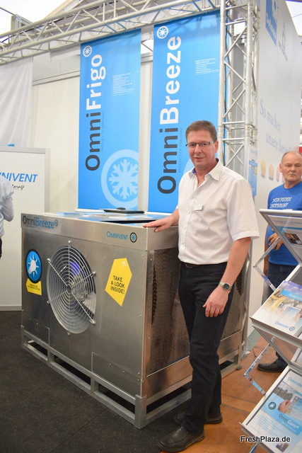 Frank Fischer von Omnivent zeigt den relativ neuen Befeuchter OmniBreeze. Die Anlage verteilt Wassendampf. Dieses feuchte Gas ist deutlich kleiner und gleixhmäßiger als kleine Tröpfe und deshalb unschädlich für die Kartoffeln. Die Anlage ist bereits an vielen Stellen in Europa im Betrieb.