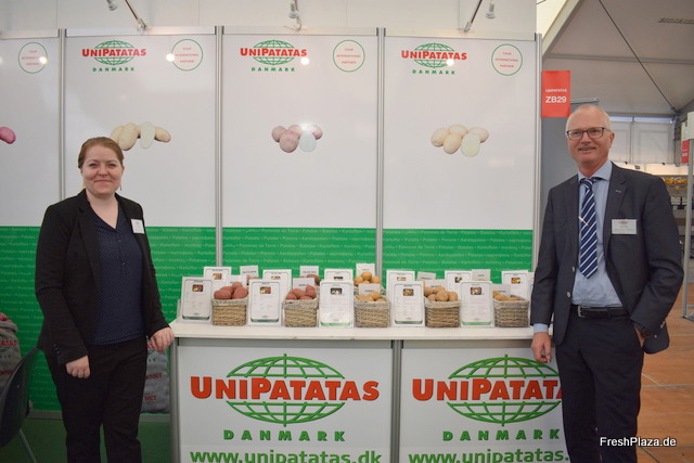 Am Stand der Züchterfirma Uni Patatas stehen Frau Charlotte Linnim Dahl und Paul Hansen für ein Gespräch zur Verfügung. Ca. 80 Prozent des Saatguts geht in den Nahen Osten. Eine Knolle mit einem großen Potenzial ist die Puntha, die sowohl als Speise- als auch als Pommessorte verwendet wird.
