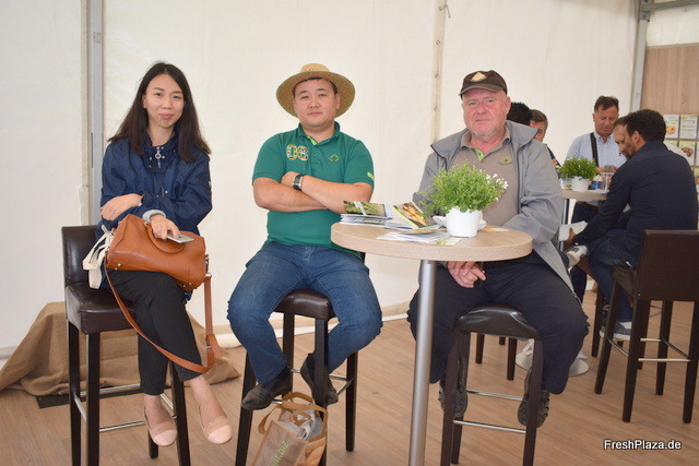 Auf dem Stand der chinesischen Branchedelegation. Frau Min Zhang (links) ist die deutschsprachige Ansprechpartnerin des Teams und kündigte die nächste Ausgabe der China Potato Expo 2019 an. Die Kartoffelbranche in China wächst in rasantem Tempo, sagte die Marketingleiterin.