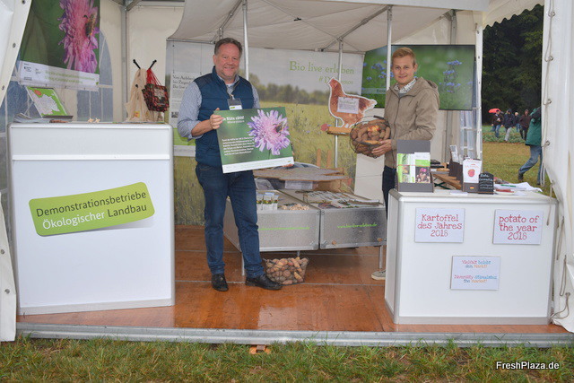 Thomas Kollnitsch und Julius Ellenberg präsentieren die vielfache Möglichkeiten des ökologischen Anbaus. Aktuell gibt es 140 Demobetriebe in gang Deutschland. Erzeuger Julius Ellenberg des gleichnamigen Biolandhofs ist das Gesicht hinter der Roten Emmalie, die Biokartoffel auf der diesjährigen Biofach zur Kartoffel des Jahres gewählt wurde.