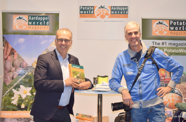 Jaap Delleman und Leo Hanse des niederländischen Fachmagazines Aardappelwereld. Die Redaktionsleitung war präsent um das nagelneue Kartoffelhandbuch zu promoten.