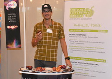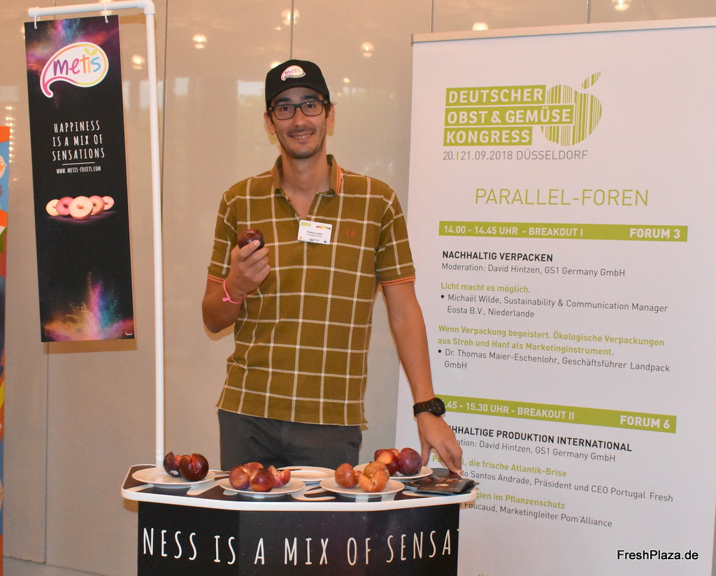 Frank Leloir am Verkostungsstand der Firma Metis aus Frankreich. Das Unternehmen hat vier hochwertige Pflaumensorten im Sortiment.