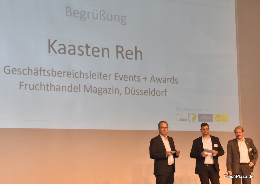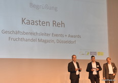 Die Moderatoren der einzelnen Veranstalter auf der Bühne: Kaasten Reh (Fruchthandel Magazine), David Hintzen (GS1) und Hans-Christoph Behr (AMI)