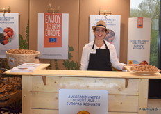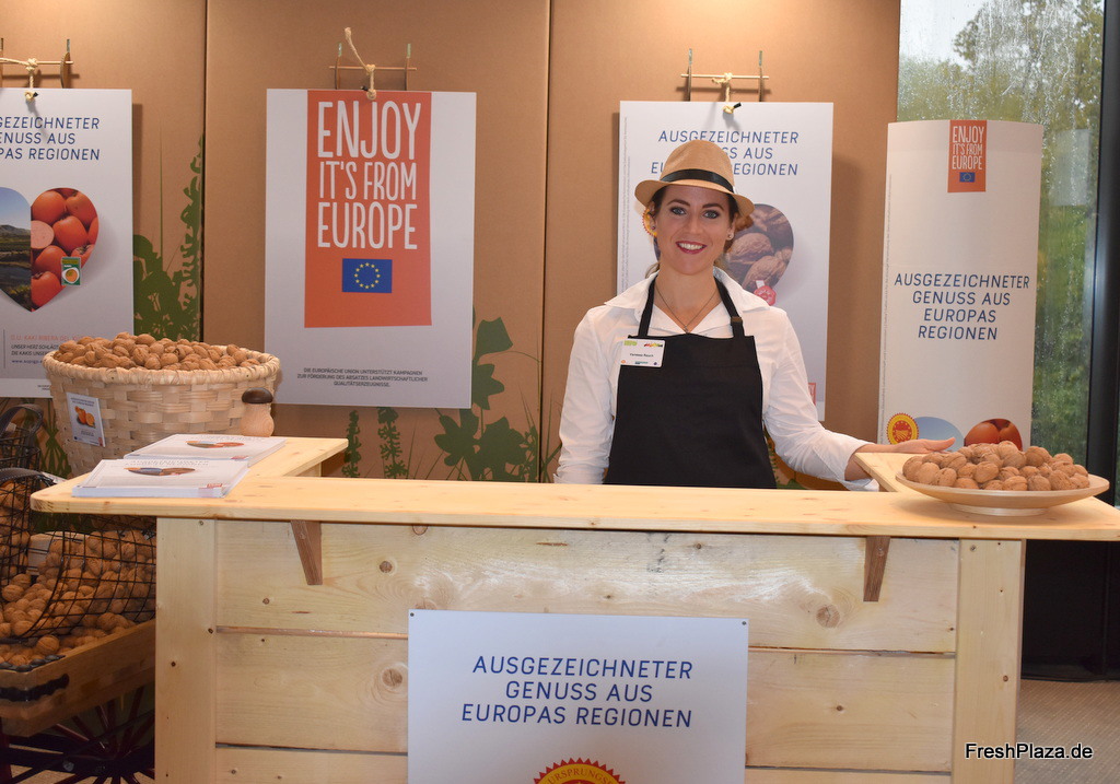 Vanessa Rausch am Stand der Kampagne Ausgezeichneter Genuss aus Europas Regionen. Die Kampagne fördert den Konsum europäischer ERzeugnisse, wie französische Walnüsse.