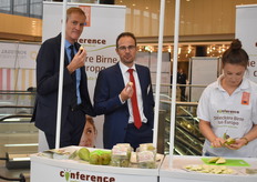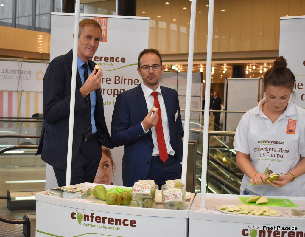 Marc Evrard (BFV) und Koen Van swijgenhoven (Vlam) lassen sich die Conference-Birnen aus belgischem Anbau gut schmecken.