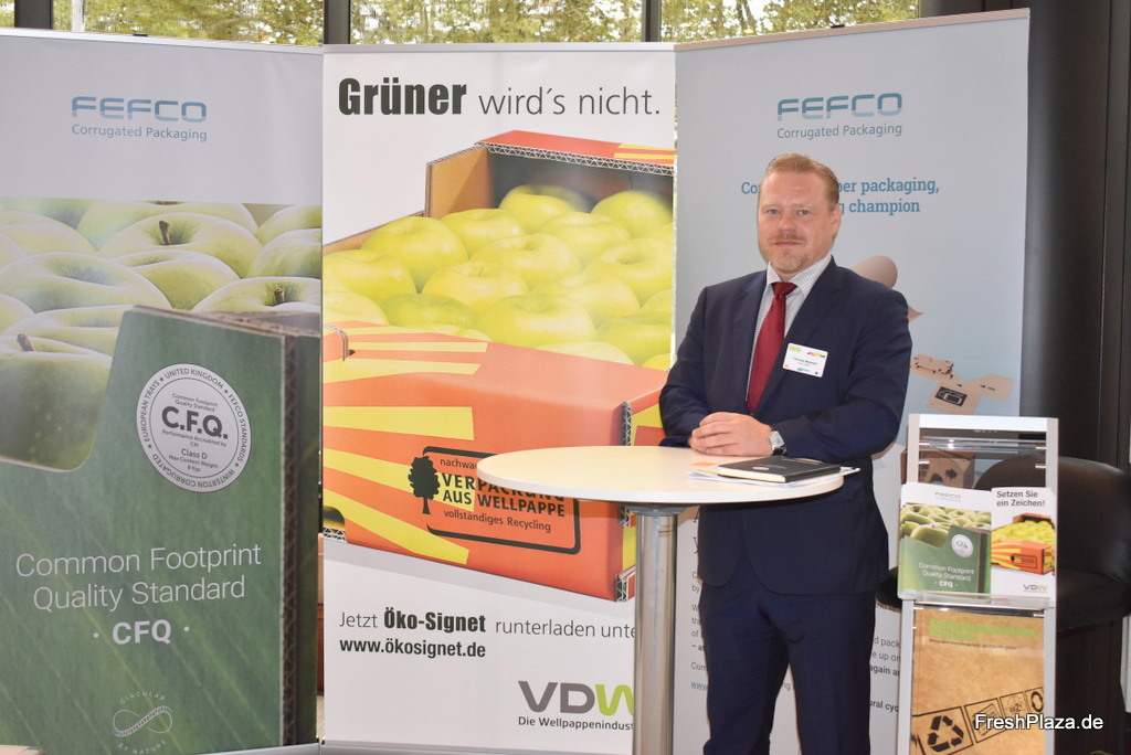 Thomas Maiwald der Firma Fefco zeigt die hochwertigen Verpackungslösungen aus Wellpappe.