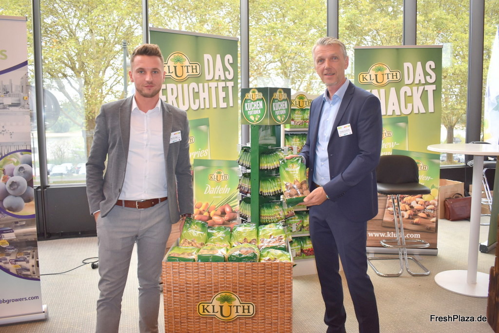 Dariusz Daga und Thomas von Borstel der Firma Kluth zeigen das interessante Produktangebot an Trockenfrüchten und Nüssen.