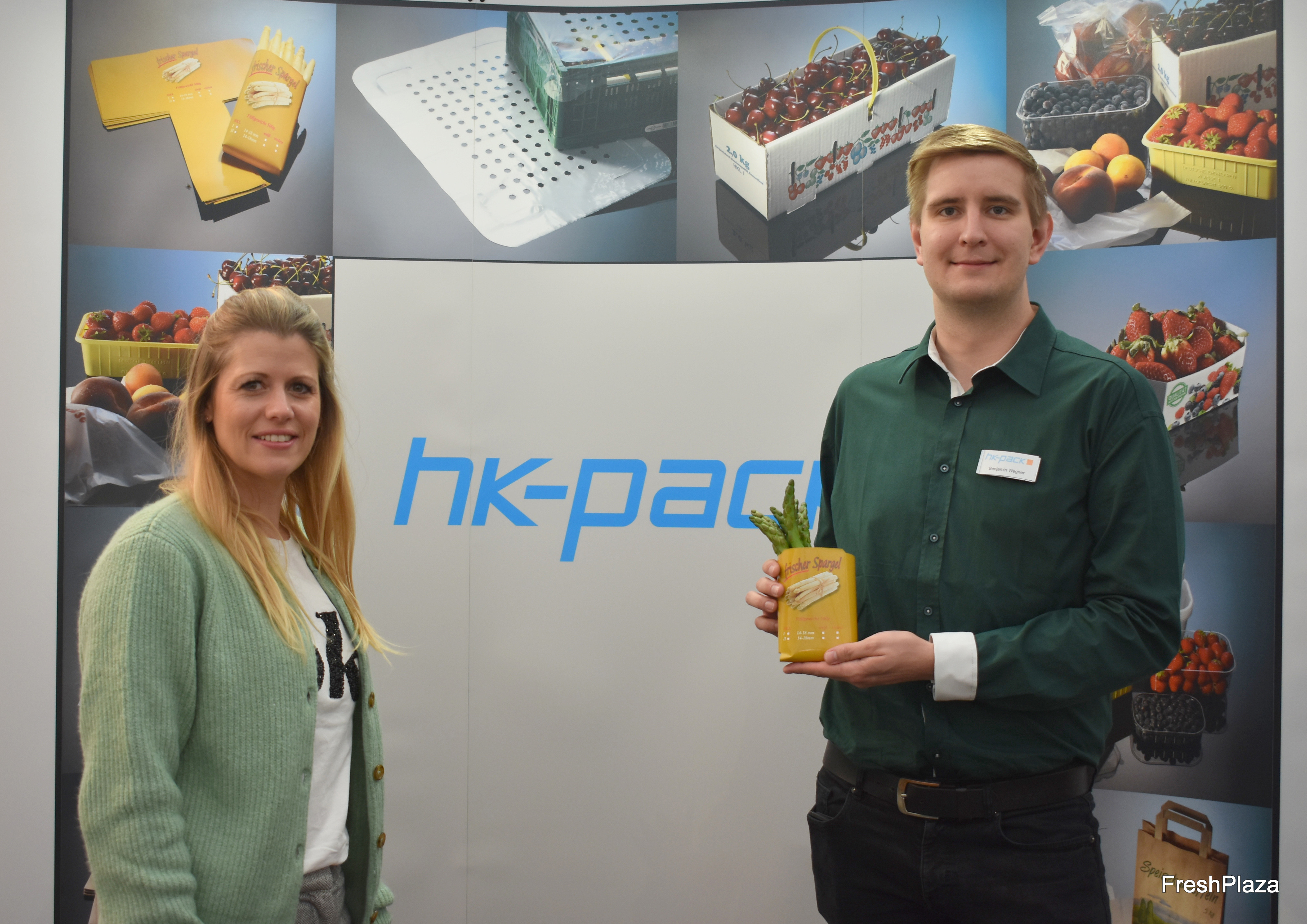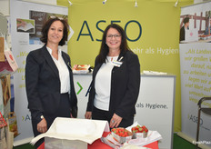 ASEO entwickelt und vertreibt moderne Verpackungen für Obst und Gemüse. Zu den Messeneuheiten gehört u.a. eine wasserresistente Spargeltüte mit recyclingfähiger Beschichtung. Die Verpackung ist leicht transparent, relativ günstig im Vergleich zu bestehenden Lösungen, und durch den Dreifarbendruck besonders als Werbemittel für den Einzelhandel oder Direktvermarkter geeignet. Auf dem Bild: Petra Wolf und Kerstin Baumert.