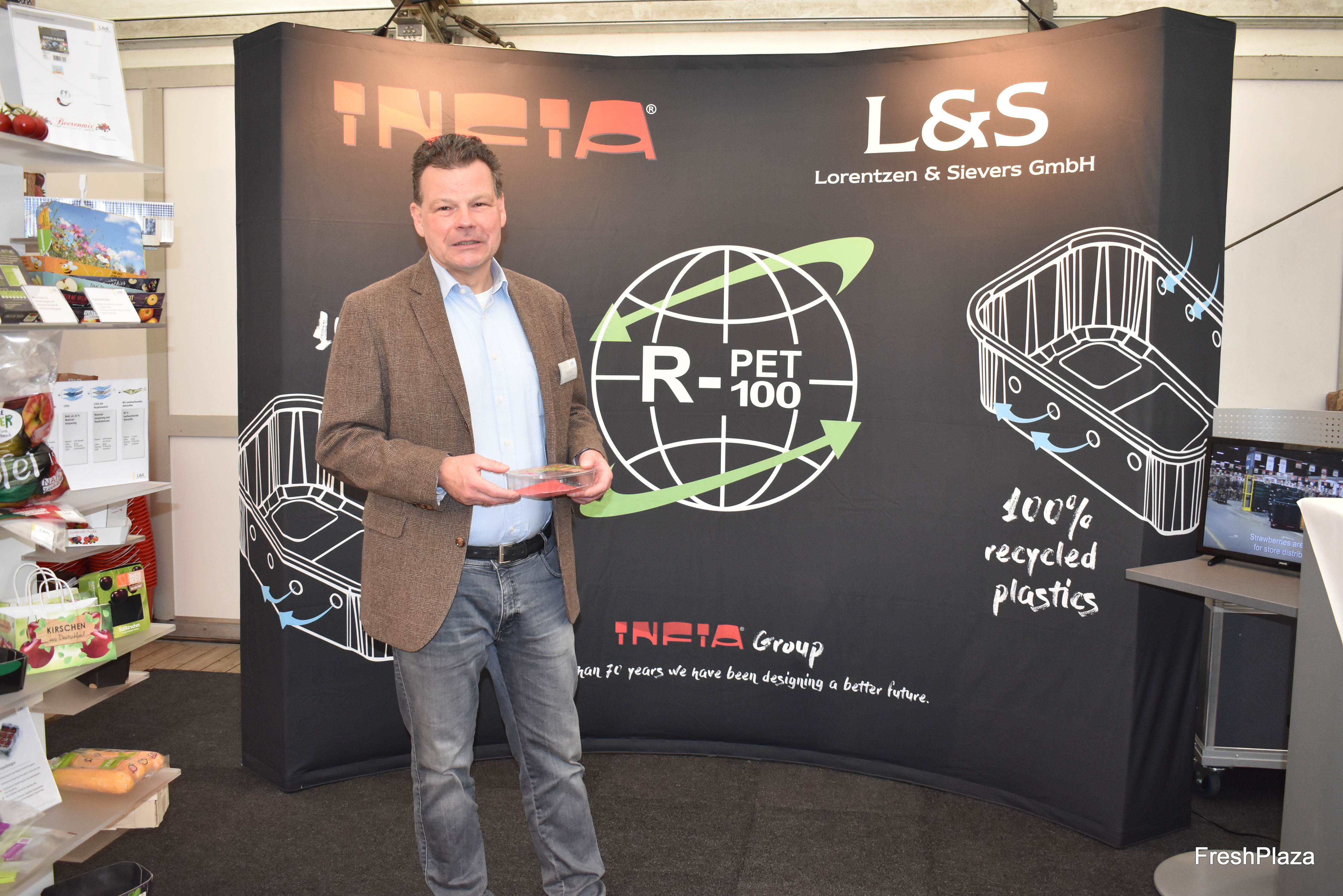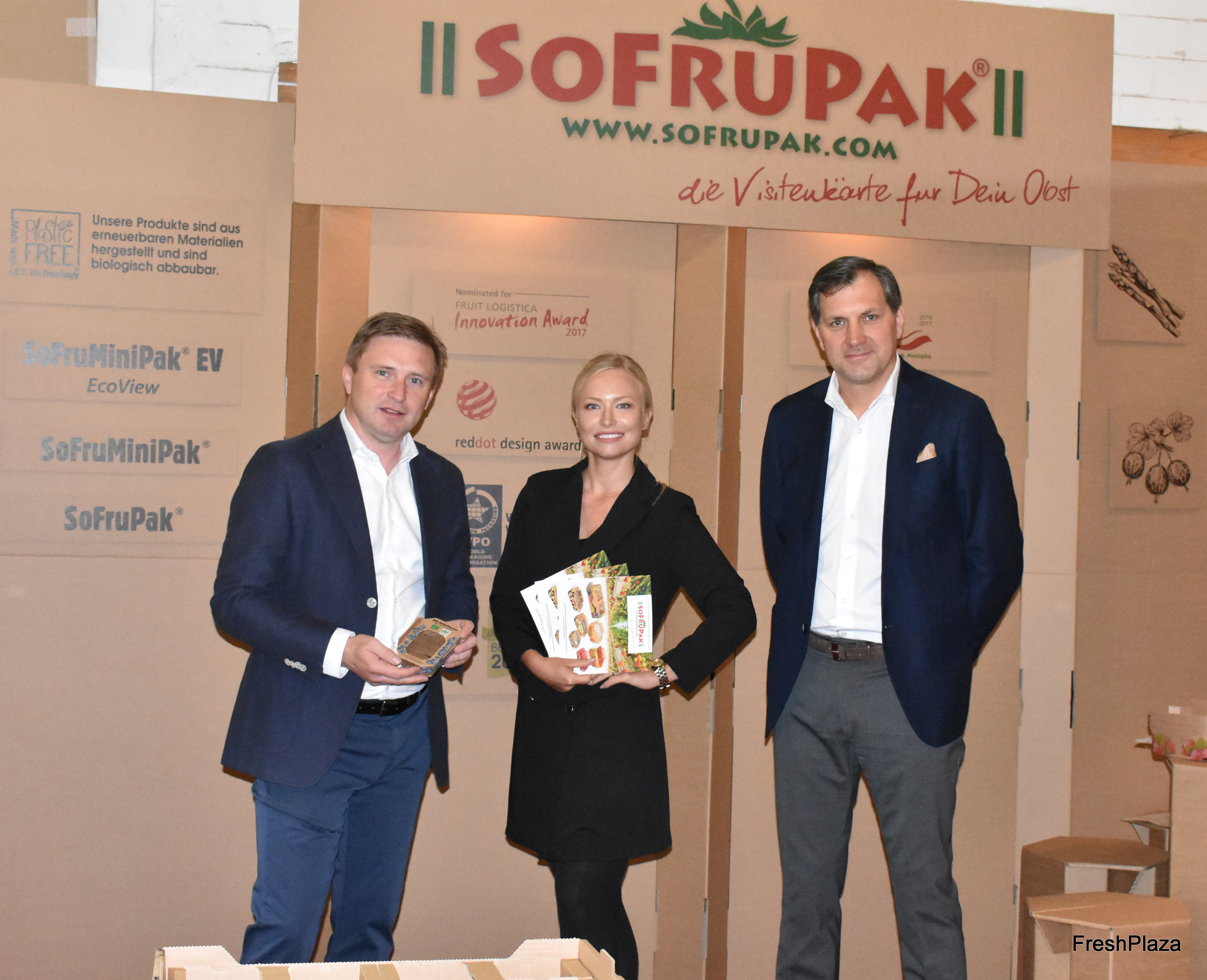 Das polnische Unternehmen Sofrupak holte sich vor 2 Jahren den Innovationspreis auf der ExpoSe in Karlsruhe. Die Firma hat nun eine neue Pappschale mit bio-abbaubarem Zellulose-Film für Beerenobst entwickelt. Die Lösung wird bereits bei Lidl-Filialen eingesetzt, sowie in Spanien und Skandinavien. Geschäftsführer Adam Sikorski (l) glaubt an das Potenzial der Verpackung, welche vorerst in 125-250 und 500g-Einheiten erhältlich ist.