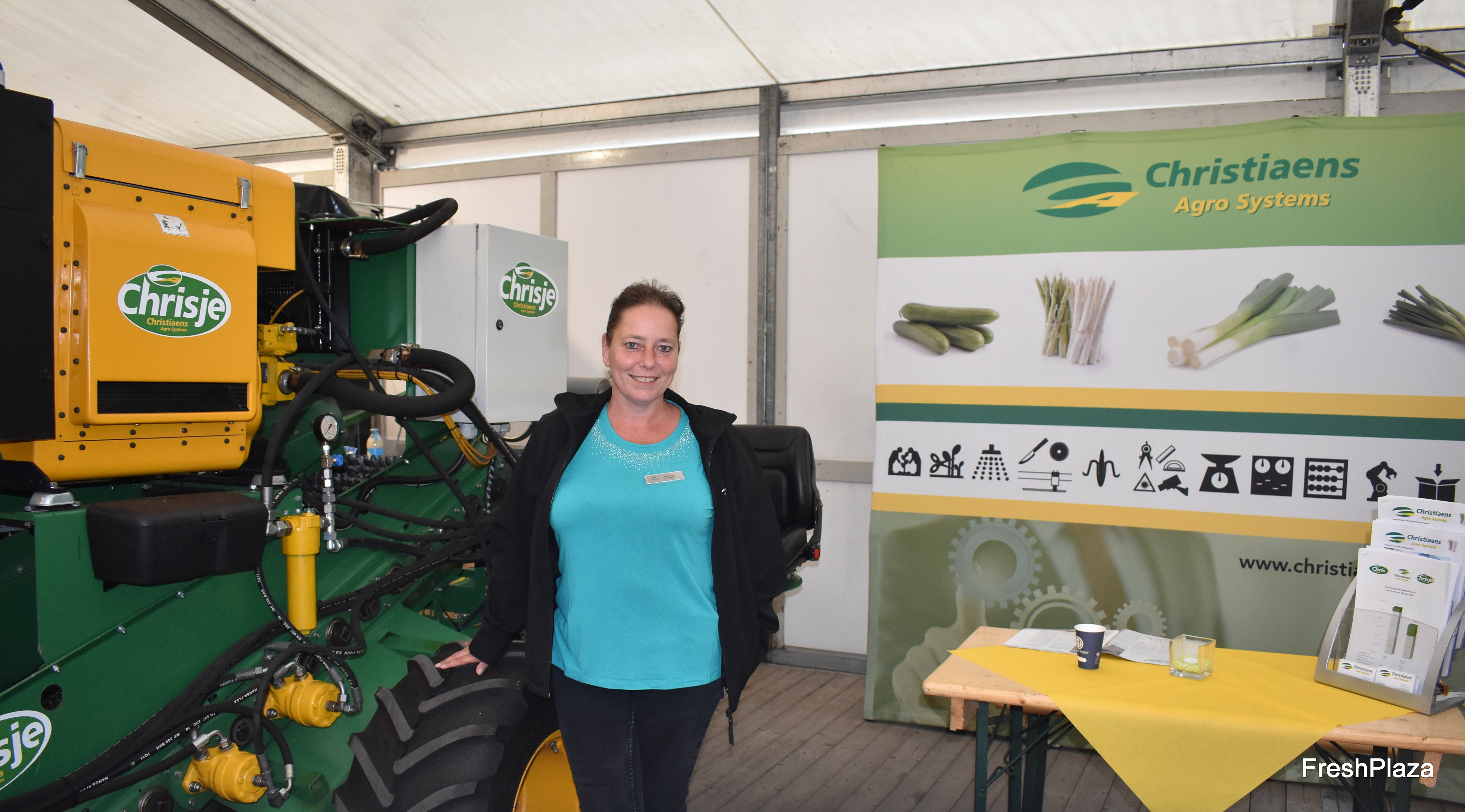 Angelique Christiaens vom gleichnamigen Unternehmen neben der Erntemaschine "Chrisje". Das Verfahren wurde 2010 erstmalig am Markt vorgestellt und wurde seitdem kontinuierlich optimiert.