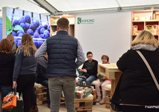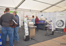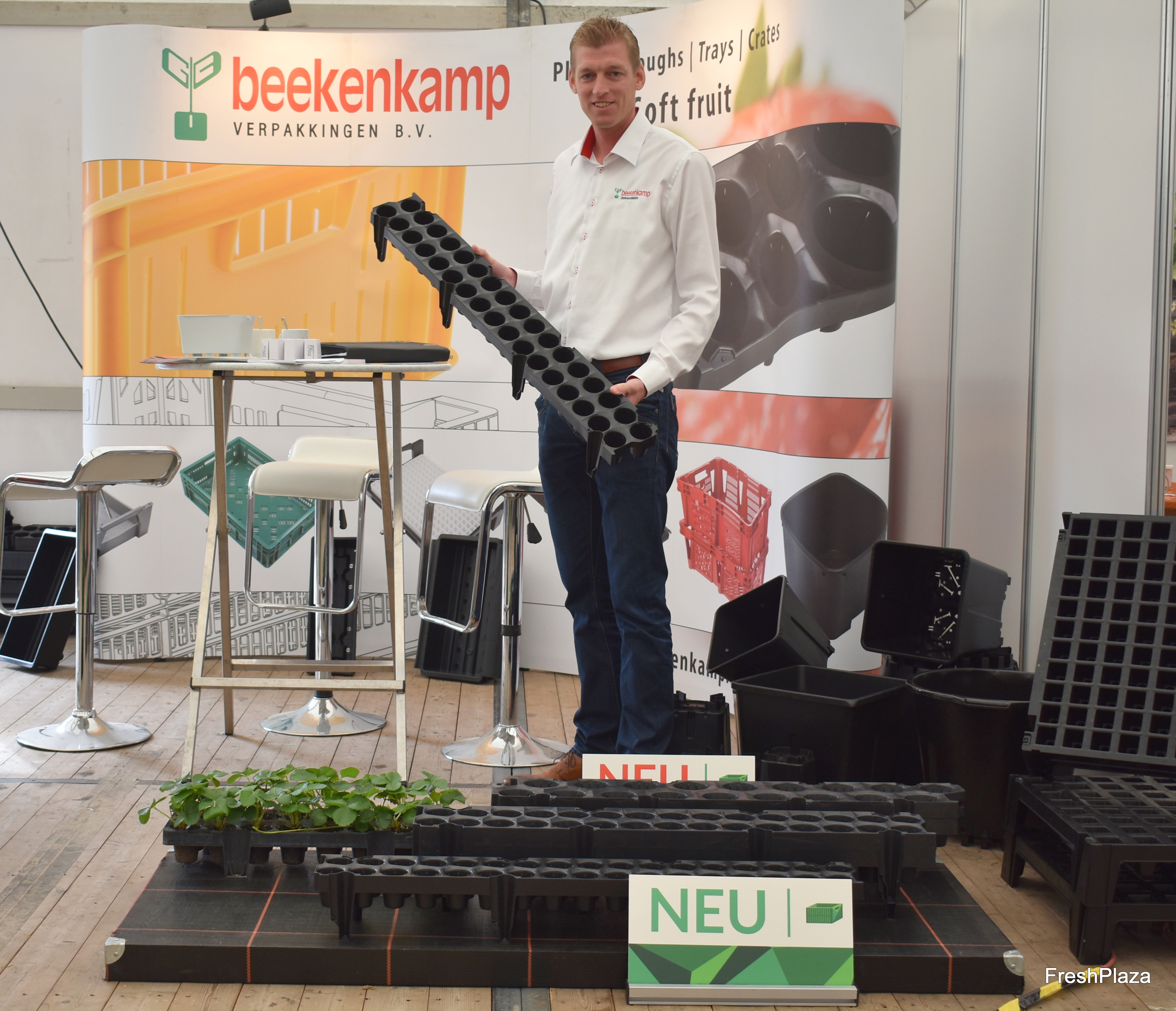 Joost van Ruijven von Beekenkamp: Das niederländische Unternehmen stellt erstmalig zwei neue Verfahren vor. Erstens wurden große Töpfe (10 bis 45l) aus recycelbaren Materialen und mit entsprechender Durchlüftung für den Heidelbeeranbau vorgestellt. Außerdem stand ein neuer Plugtray mit 34 Löchern für Erdbeeren besonders im Fokus.