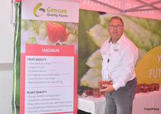 Heiner Lenssen von Genson Jungpflanzen. Die relativ neue Erdbeersorte Magnum hat laut dem Berater ein interessantes Potenzial. Der Juni-Träger hat einen hohen Ertrag, einen aromatischen Geschmack und große Früchte. Die Sorte eignet sich sowohl für den Gewächshaus- als auch Freilandanbau, heißt es weiter.