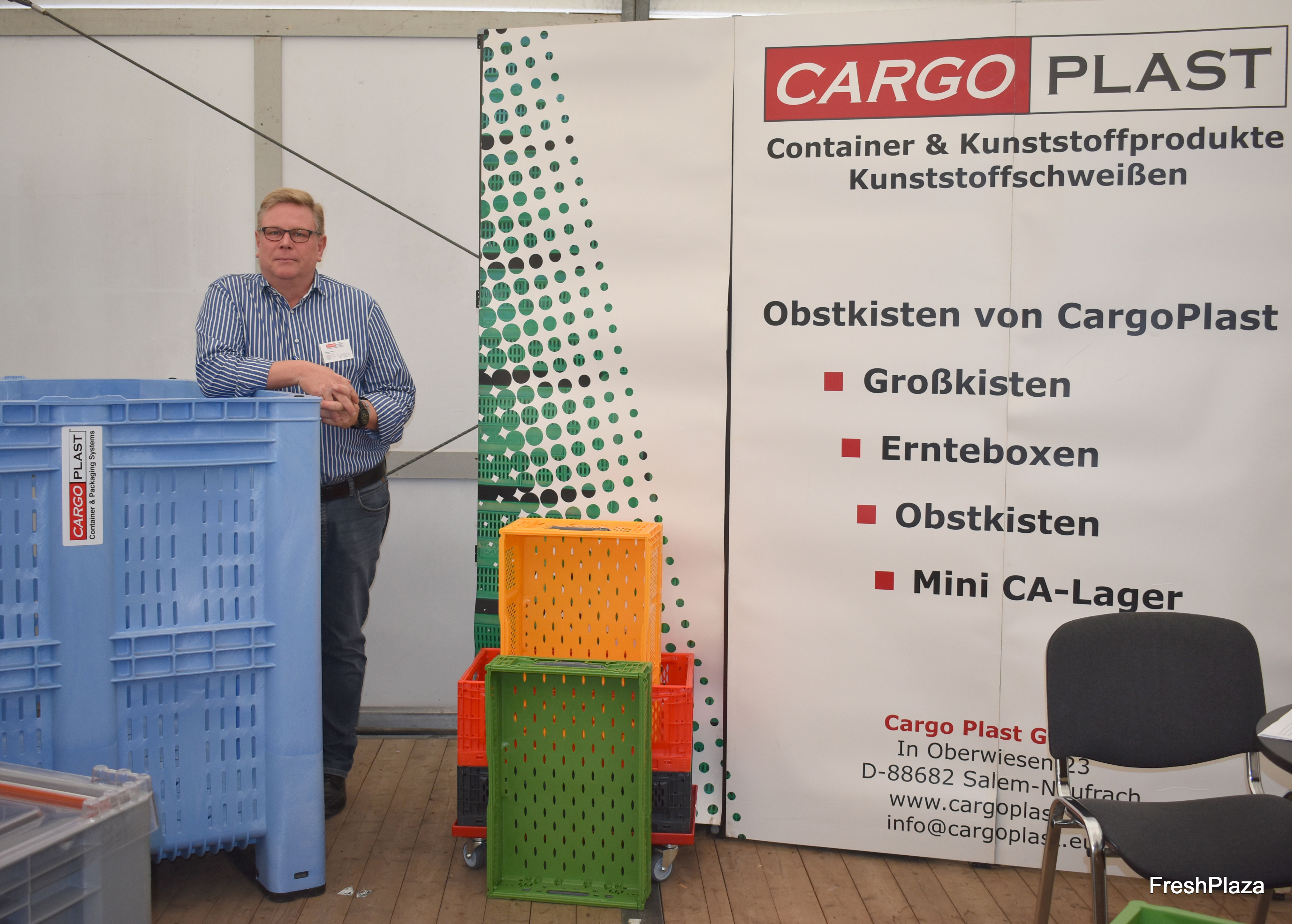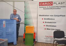 Andreas Goslar vertritt das süddeutsche Unternehmen Cargoplast und ist als Ansprechpartner für Norddeutschland bei der Firma tätig. Cargoplast hat sich auf die Entwicklung und Vermarktung von Transportbehältern für Obst und Gemüse spezialisiert. Links auf dem Bild eine Kartoffelkiste mit einer Tonne Nutzlast.