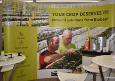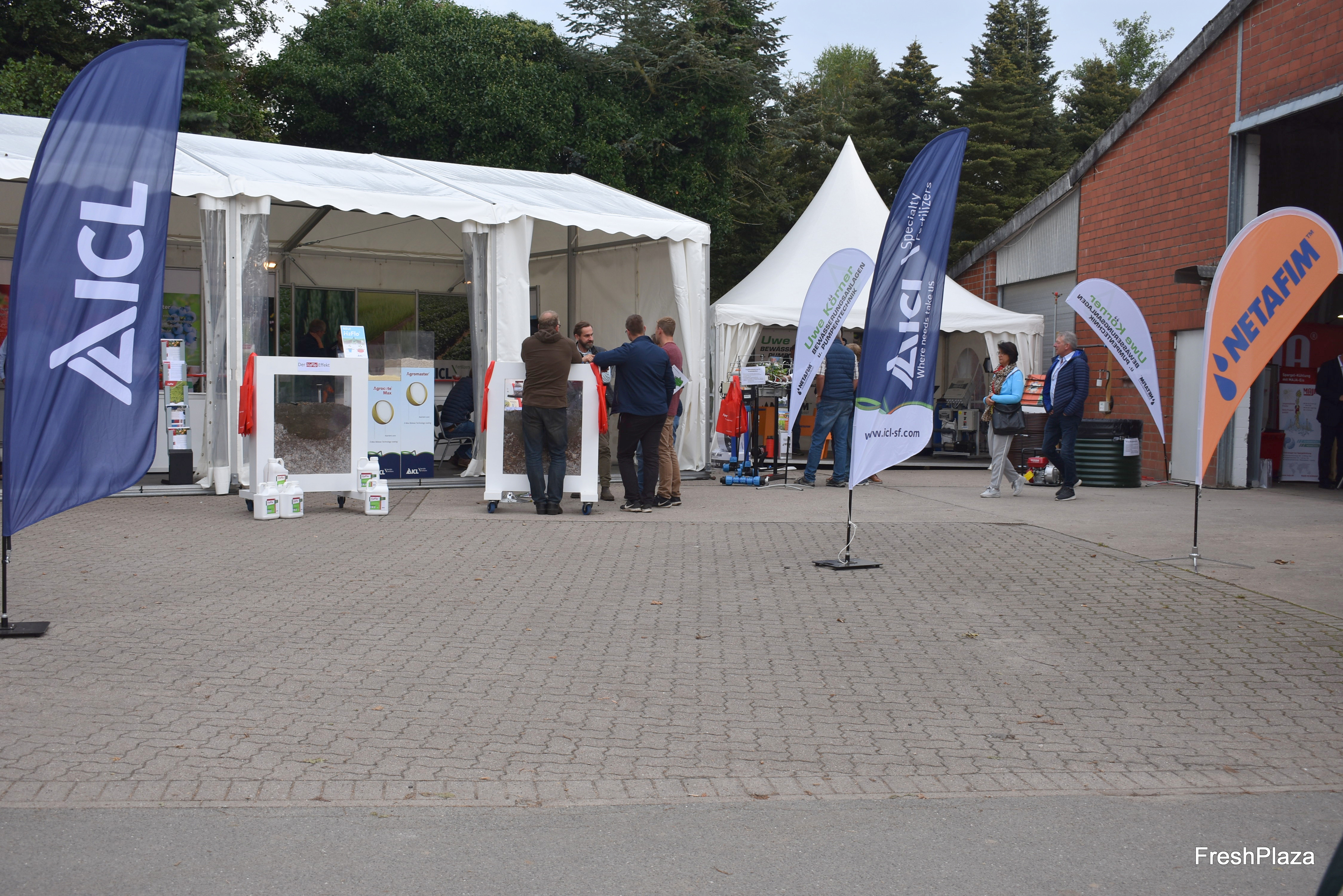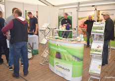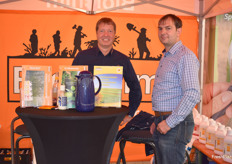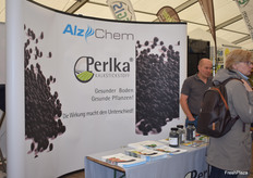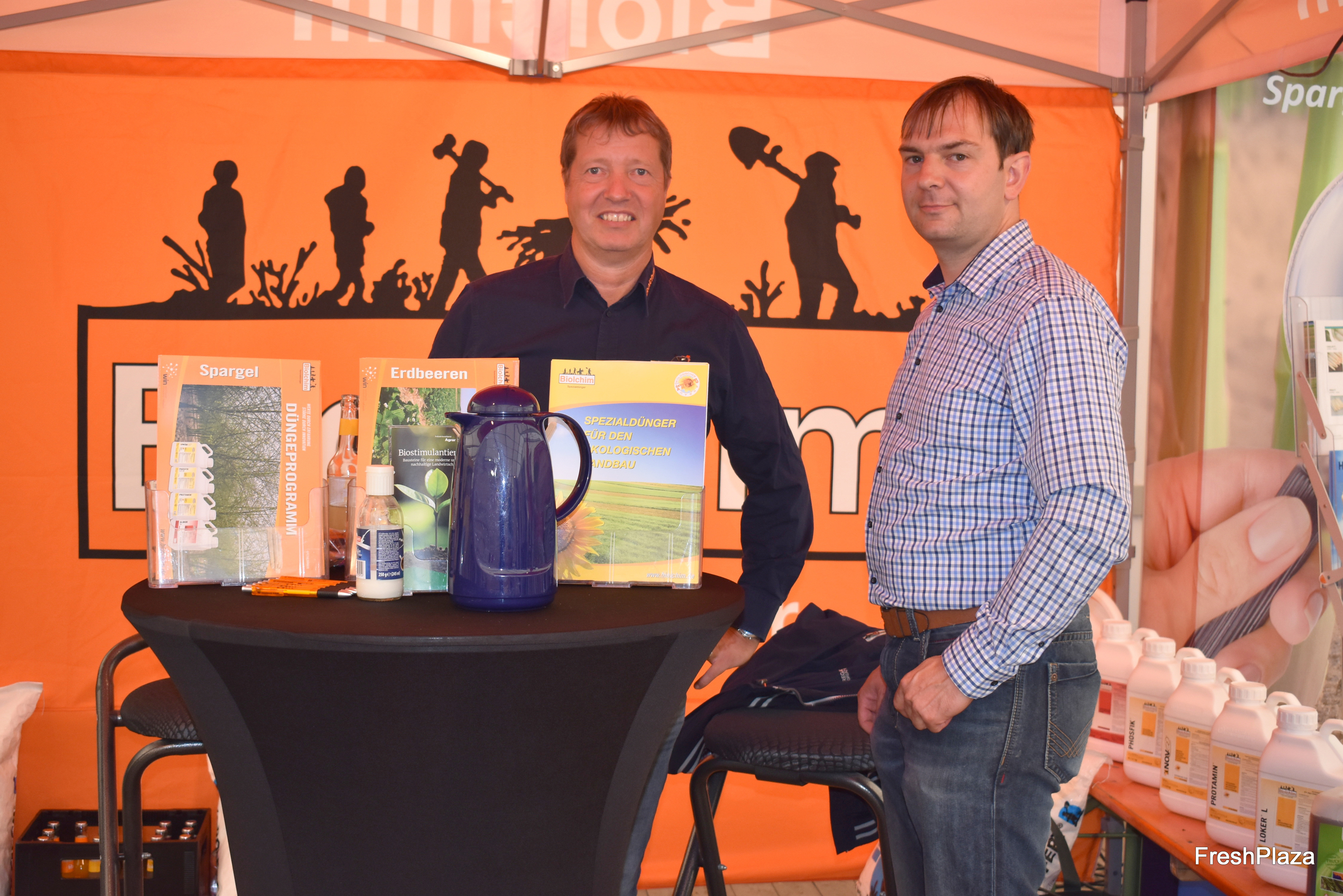 Am Stand der Firma Biolchim: Das Unternehmen liefert u.a. Spezialdünger, Produkte für den ökologischen Anbau, Blattdünger, Fertigationsdünger, Spuren- und Sekundärelemente und ergänzende Spezialprodukte, so Holger Brechtel (l).