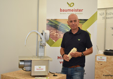 Dietmar Baumeister präsentierte seine Gummiringbündler, u.a. für Spargel, Lauchzwiebeln und Suppengrün. Die Gummibänder können teilweise sogar mitgekocht werden ohne weiteren Einfluss aufs Produkt, meint Baumeister. "Der Bündelexperte" wird später im Jahr auch auf der ExpoSE ausstellen.