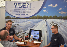 Die Messevertreter von VOEN Vöhringer beraten einen potenziellen Kunde. Das süddeutsche Unternehmen entwickelt und vertreibt Schutzabdeckungen für den Obstbau. Links auf dem Bild Marketingleiter und Unternehmenssprecher Rainer Weiss.