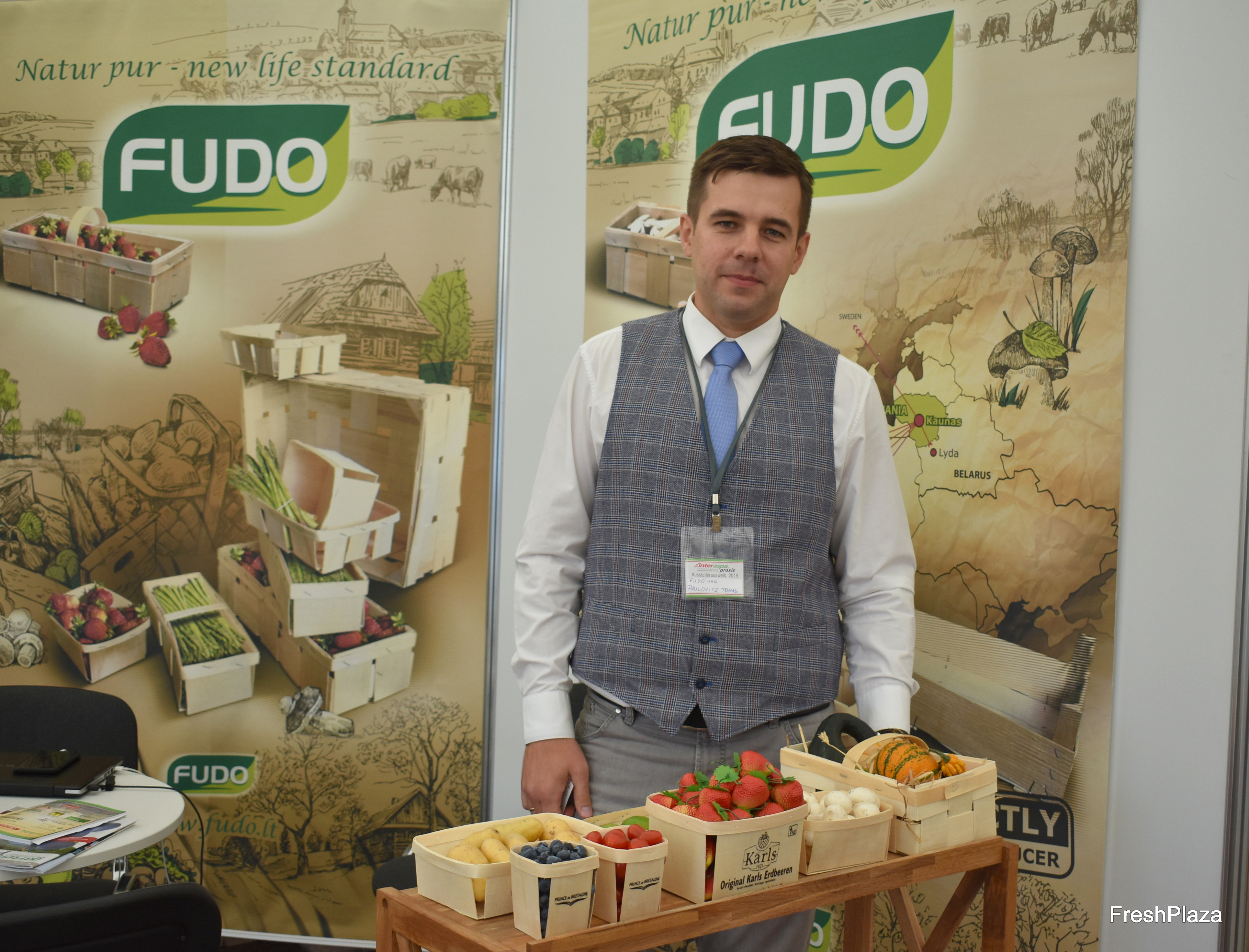 Tomas Paulovitz des litauischen Unternehmens Fudo ist erstmalig auf der Interaspa vertreten. Die Firma hat sich auf die Herstellung und Vermarktung von Holzschliffverpackungen und Spankörbe spezialisiert.