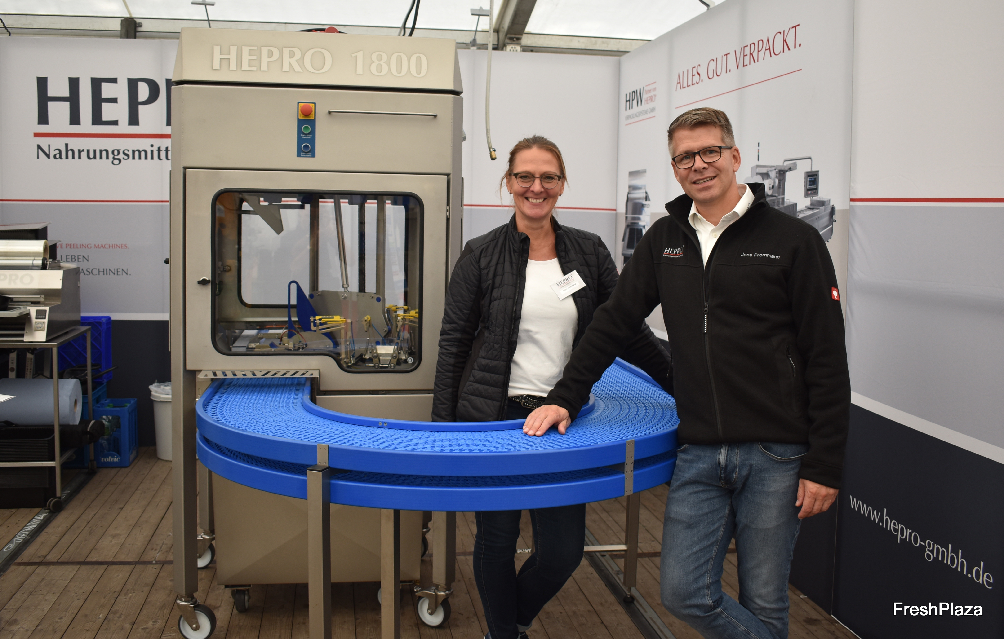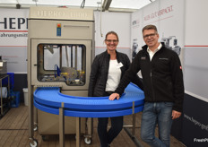 Jens Frommann und Ellen Reinhold von Hepro GmbH zeigen die Hepro 1800-Anlage. Das neue Kurvenband erlaubt Höchstleistungen von 2.400 St./h, berichtet man.