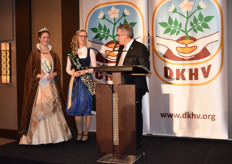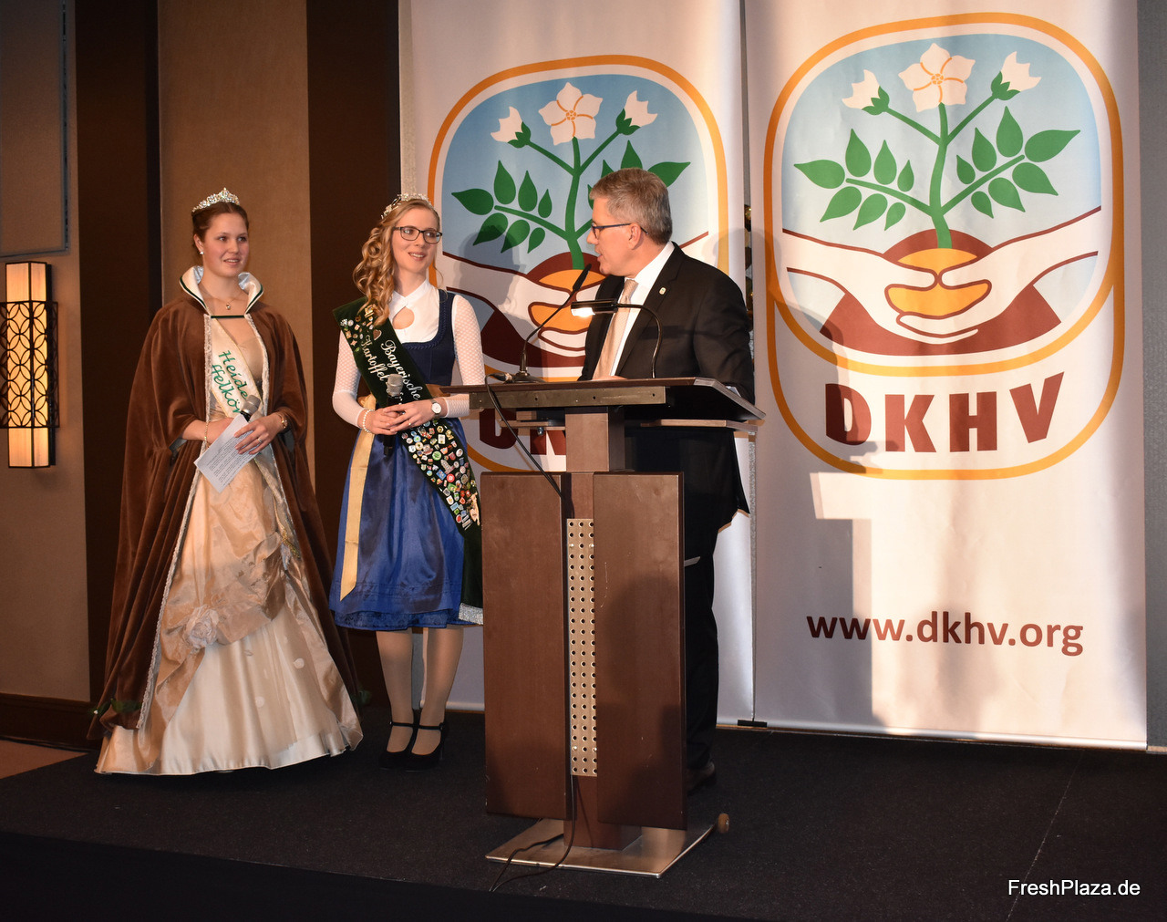 DKHV-Präsident Thomas Herkenrath richtet ein Dankeschön an die beiden Kartoffelköninginnen von Niedersachsen (l) und Bayern (mitte) für ihr Engagement und ihren Einsatz im vergangenen Jahr.
