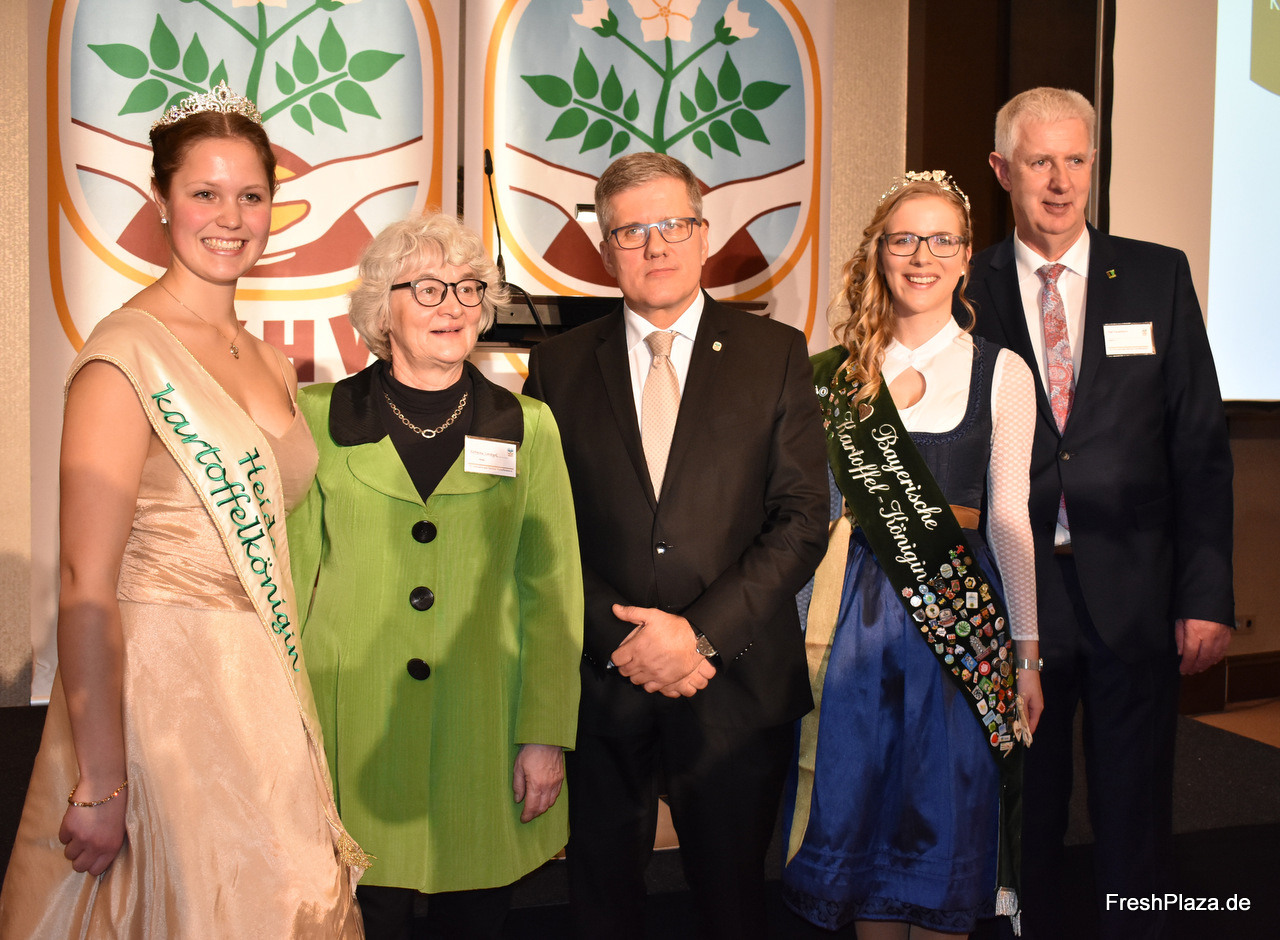 Amtsträger untereinander: Die niedersächsische Kartoffelköningin, Frau Katarina Landgraf (CDU-Mitglied des Bundestages) , DHV-Präsident Thomas Herkenrath, die bayerische Kartoffelköningin und UNIKA-Vorstandsvorsitzender Olaf Feuerborn.