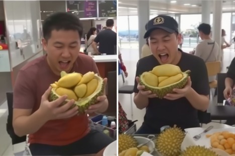 Chinesische Familie isst 5,5 kg Durian vor thailändischem Flughafen