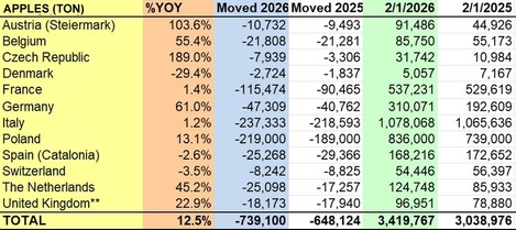 Europäische Apfelbestände steigen im Jahresvergleich um 12,8 Prozent auf 4.158.867 Tonnen